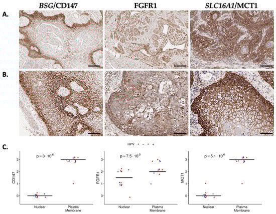 Expression of select surfaceome proteins from top quartile of gene expression. (A) Primary PSCCs (n = 12) were stained for BSG/CD147 (left), FGFR1 (middle), and SLC16A1/MCT1 (right) proteins; top row demonstrates representative staining patterns. (B) Magnification (20×; scale bar is 50 μm) of representative sections demonstrating nuclear vs. membrane localization. (C) Percent of cells with protein expression at the plasma membrane vs. the nuclear compartment (see Section 2 for details). Tumor samples were labeled by HPV status (blue circle = HPV-neg; red triangle = HPV-pos).