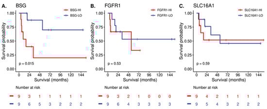 Overall survival association with select surfaceome gene expression. Target genes (A) BSG/CD147, (B) FGFR1, (C) SLC16A1/MCT1 were dichotomized into high and low by the median gene expression value. Kaplan–Meier estimates are shown with log-rank comparison between groups.