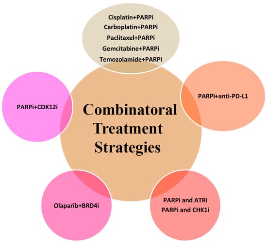 Potential novel combinatorial treatment strategies with PARPi. Combinations with chemotherapy; combinations with immunoregulators; and combinations with molecules associated with DNA repair, BET inhibitors, or immune checkpoint kinase inhibitors are among the promising strategies that may be used in combination with the PARPi treatment.