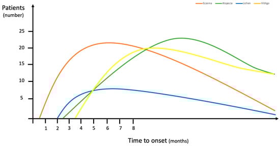 An eczematous reaction was the most frequently reported cAE in our cohort. Eczematous lesions can be often misdiagnosed as maculopapular or lichenoid rashes by non-dermatologist physicians; thus, a diagnostic biopsy should be indicated in any case of clinical doubt. This is further supported by the heterogeneous clinical presentation of lichenoid and maculopapular lesions, often depending on the association with pruritus. Indeed, the maculopapular rash reported in our patient cohort was also frequently associated with an itching sensation, but the skin lesions were less crusty and more erythematous, and slightly raised on the skin surface (Figure 2). Maculopapular reactions, such as itching, may also precede the onset of other skin diseases, and, in agreement with previous studies [13,14], it occurred early in our patients (Figure 1).