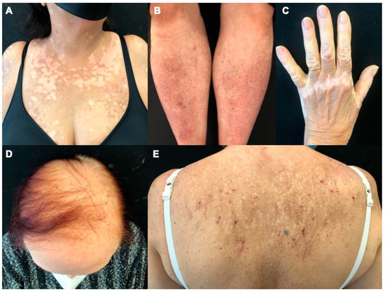 Clinical pictures of cutaneous adverse events to CDK4/6i. (A), Vitiligo-like lesions made of multiple hypopigmented macules with ill-defined margins on the patient’s sun-exposed chest. (B), Erythematous maculopapular lesions on bilateral pretibial areas. (C), Vitiligo-like lesions located on the back of the left hand. (D), Alopecia of the central area of the scalp. (E), Eczematous reaction on patient’s back showing few scratched maculopapular lesions on the post-inflammatory hyperpigmented area.
