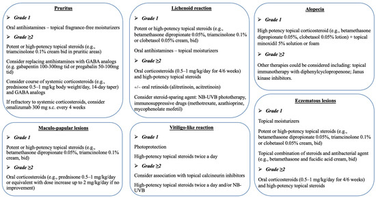 Dermatologists performed cAE diagnosis based on typical clinical manifestations; in uncertain cases, a biopsy was performed for histopathological confirmation. Each cAE was graded according to the Common Terminology Criteria for Adverse Events, version 5.0 (CTCAE v5.0) [17]. Based on our EADV task force consensus and improvement in CTCAE grade, the dermatologic therapy outcome was classified as a complete response (CR), partial response (PR), or no response (NR). A CR was defined as remission of clinical cutaneous lesions and related symptoms; PR was used for at least a 30% decrease in the body surface area (BSA) affected by cutaneous reactions; and NR encompassed lesions with less than a 30% improvement, stable disease, and worsening of the skin AE.