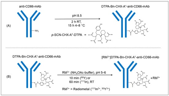 Graphical visualization of the conjugation-reaction process of the anti-CD66-mAb with the chelator p-SCN-CHX-A″-DTPA (A) and the subsequent radiolabeling procedure of the DTPA-anti-CD66-mAb with the radiometal (90Y, 111In, 99mTc) (B).
