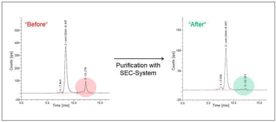 Exemplary radiochromatograms of the 90Y-labeled anti-CD66-mAb before and after SEC-purification. Radiolabeled DTPA-CHX-A″-anti-CD66-mAb (anti-CD66) was detected at a retention time of ~8.5 min. A small fraction of radiolabeled mAb-complexes was observed at 7.5 min, while unbound 90Y was seen at a retention time of 12.3 min. The unbound 90Y fraction was reduced by SEC purification (color highlighted areas).