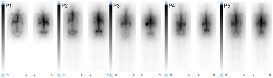 Post-therapy anterior and posterior images after RIT are shown for each patient (P1–P5). Whole-body planar scintigraphies were obtained 1 d after RIT started on a Siemens Symbia T2 using the ME collimator. For each patient image the scale was normalized to the individual liver value (100%).