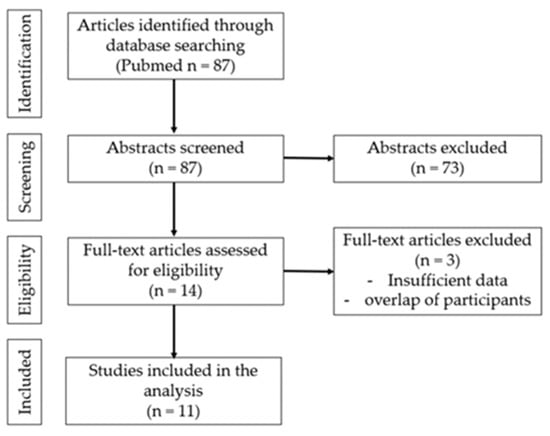 Figure 1 shows the flowchart of the studies retrieved from the literature search and included in the analysis. Abstracts of the articles were reviewed according to pre-defined criteria. The full text of the subject papers was then evaluated, and data were extracted. An initial search identified 87 articles, of which 14 complete text articles were assessed and 11 were included [21,22,23,24,25,26,27,28,29,30,31].