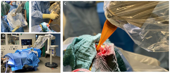 (A) Connection of the spherical applicator with the X-ray source and sterile draping; (B) Manual applicator positioning into the resection cavity; (C) Intraoperative view of the inserted applicator in the resection cavity; (D) Intraoperative set-up prior to the start of IORT.