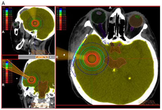 - Milano, M.T.; Grimm, J.; Niemierko, A.; Soltys, S.G.; Moiseenko, V.; Redmond, K.J.; Yorke, E.; Sahgal, A.; Xue, J.; Mahadevan, A.; et al. Single- and Multifraction Stereotactic Radiosurgery Dose/Volume Tolerances of the Brain. Int. J. Radiat. Oncol. Biol. Phys. 2021, 110, 68–86. [Google Scholar] [CrossRef]