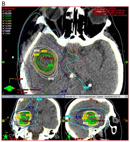 Despite the increasing use of local adjuvant RT, there is no definite standard for target delineation. A recent consensus guideline recommended enclosing the surgical tract and, if necessary, a margin for the bone flap, venous sinus, and pia mater in cases where the BM abuts the appropriate structures [103]. Based on several studies, adding a 2–3 mm margin to the resection cavity for the planned target volume (PTV) seems beneficial for LC [116,141,142]. However, a safety margin can be discussed controversial. A meta-analysis from 2013 including 629 patients did not find an effect of an extra margin on LC, and in the aforementioned study (n = 500, SRS 15.2%, hFSRT 84.8%), no difference was detected for margin (1–3 mm; 76% of cases) vs. no margin [124,143].