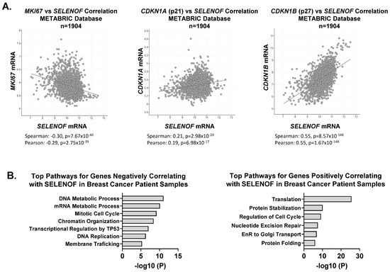 The increased proliferation resulting from the loss of SELENOF prompted an examination of changes in cell cycle distribution and regulators of the cell cycle. SELENOF KO cells displayed a significant accumulation in the S-phase, consistent with their increased proliferation (Figure 3A). Furthermore, the loss of SELENOF led to reduced levels of the cyclin-dependent kinase inhibitor proteins, p21 and p27 (Figure 3B). A similar pattern of p21 and p27 expression levels was observed in 3D acini derived from SELENOF KO cells (Supplementary Figure S3). The inhibitory p21 and p27 proteins block the activity of cyclin-dependent kinase 2 (CDK2) [26]. Treatment of SELENOF KO cells with the CDK2 inhibitor, K03861, resulted in a significant reduction in cell viability (Figure 3C) and enhanced cell death (Figure 3D and Figure S5) compared to isogenic WT control cells. In contrast, when SELENOF was overexpressed in MCF-7 breast cancer cells, which have low endogenous levels of SELENOF, using a doxycycline (Dox)-inducible system [6], there was a significant increase in p21 and p27 levels (Figure 3E). A non-specific effect of Dox was ruled out in control cells (Supplementary Figure S4D). Silencing either p21 or p27 (Supplementary Figure S4A–C) significantly rescued the previously reported cell death phenotype associated with SELENOF overexpression in these cells [6] (Figure 3F). Consistent with this observation, SELENOF mRNA was found to negatively correlate with Ki67 and positively correlate with p21 and p27, as determined using the METABRIC breast cancer patients’ database (Figure 4A). In METABRIC tumor samples, the top 400 genes co-expressed with SELENOF were identified, and pathway enrichment analysis was conducted. Pathways enriched in genes negatively correlating with SELENOF included ‘Mitotic Cell Cycle’ and ‘DNA Replication’ (Figure 4B, left panel), while pathways enriched in genes positively correlating with SELENOF included ‘Regulation of Cell Cycle’ (Figure 4B, right panel). Other top enriched pathways were ‘Translation’, ‘Endoplasmic Reticulum to Golgi Transport’, and ‘Protein Folding’ (Figure 4B), which are consistent with previous reports of SELENOF’s role in protein folding and redox quality control [11,17]. Together, these data indicate that the regulation of p21 and p27 contributes to SELENOF-driven effects on the cell cycle, proliferation, or cell death.
