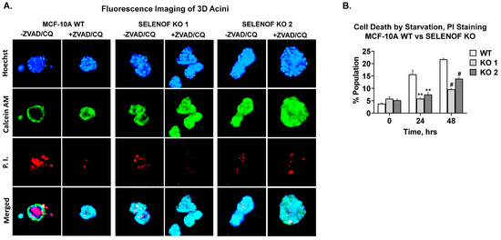 Loss of SELENOF renders MCF-10A cells resistant to apoptosis and autophagy. (A) Fluorescence images of 3D acini at 4× generated from MCF-10A WT or SELENOF KO cells. All cells were seeded in 5% matrigel for 5 days prior to treatment with −/+ 10 µM ZVAD and −/+ 5 µM CQ, then grown for another 15 days. The first row shows representative images of Hoechst 33,342 staining of nuclei in blue. The second row shows representative images of Calcein AM staining of live cells in green. The third row shows representative images of propidium iodide (PI) staining of dead cell in red. The last row shows a merged image of all three stainings. (B) Cell death was estimated using FACS of cells stained with PI after 24 or 48 h of serum deprivation. ** p < 0.01, # p < 0.0001.