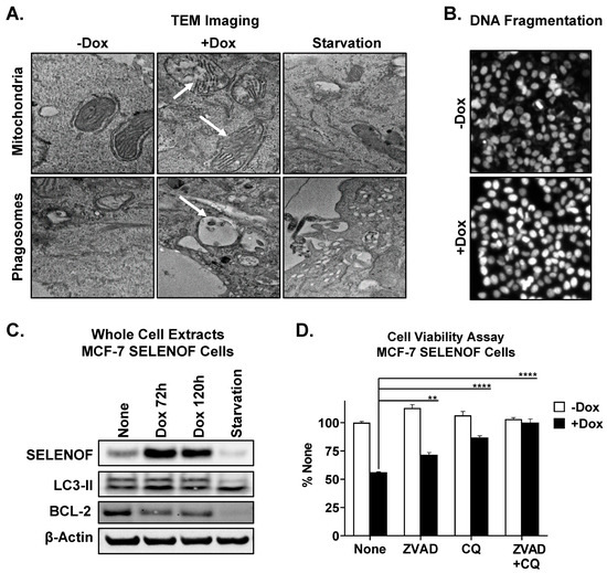 SELENOF overexpression induces apoptosis and autophagy in breast cancer cells. (A) Transmission electron microscopy analysis of MCF-7 SELENOF cell treated with −/+ 1 µg/mL Dox for 72 h. Examples of the observed mitochondrial morphology (top row) and phagosome formation (bottom row) are indicated by arrows. Serum starvation (last column) for 24 h was used as a positive control for autophagy. (B) DNA fragmentation was estimated using Hoechst 33,342 staining in cells treated as described in (A). (C) The levels of SELENOF and LC3-II were determined using Western blotting in whole cell extracts from MCF-7 SELENOF cells treated with 1 µg/mL Dox at the indicated times. Serum starvation for 24 h was used as a positive control for autophagy. β-Actin is shown as a loading control. The uncropped blots are shown in File S1. (D) Cell viability was determined using crystal violet staining of cells treated with −/+ 1 µg/mL Dox, −/+10 µM ZVAD, and −/+5 µM chloroquine (CQ) for 5 days. Data are normalized to vehicle control and shown as 100%. ** p < 0.01, **** p < 0.0001.