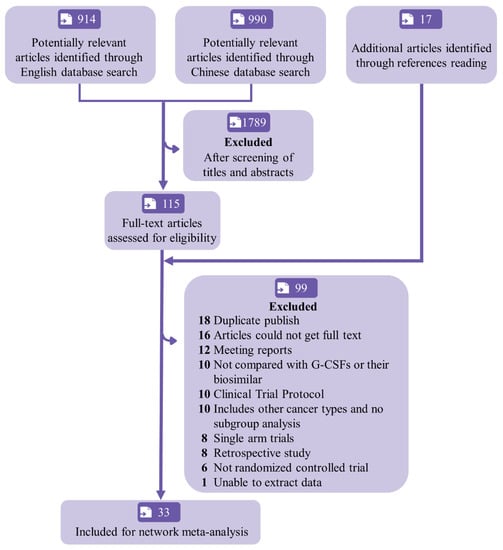 A total of 1921 articles were retrieved (Figure 1). After the titles and abstracts were screened to exclude irrelevant studies, the full texts of the remaining 132 articles were read, and 99 were further excluded. Finally, 33 eligible RCTs were included [10,11,12,13,21,22,23,24,25,26,27,28,29,30,31,32,33,34,35,36,37,38,39,40,41,42,43,44,45,46,47,48,49]. Among the included RCTs, 15 were multi-centric. A total of 7988 breast cancer patients were included (Table 1). The timing of G-CSF administration varied among the studies: 6 studies started G-CSF administration 48 h after chemotherapy, whereas the other 27 studies started 24 h after chemotherapy. The most frequently used chemotherapeutic regimen was TAC (39%), followed by AT (36%).