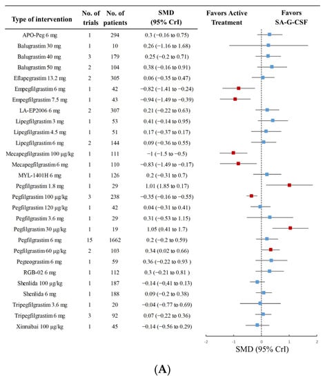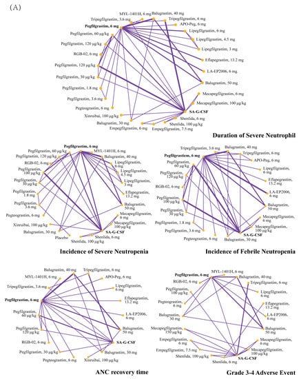 Granulocyte colony-stimulating factor (G-CSF) is a conventional intervention for preventing chemotherapy-induced neutropenia [5,6]. Currently, various G-CSF drugs, such as short-acting G-CSF (SA-G-CSF), long-acting G-CSF (LA-G-CSF), and their analogues, are available for patients undergoing chemotherapy [7,8]. The efficacy of LA-G-CSF is reported to be comparable to that of SA-G-CSF [9]. However, recent randomized controlled trials (RCTs) have suggested that certain LA-G-CSFs would be more effective for reducing the incidence of FN and SN, and shortening the duration of SN (DSN) [10,11,12]. Although several systematic reviews have compared the efficacy and safety of LA-G-CSFs and SA-G-CSF, they did not employ a network meta-analysis methodology and had varying criteria for study inclusion, which compromised the quality of their evidence. Moreover, these reviews did not include the G-CSF medications that are widely utilized in China. Additionally, the conclusions drawn from these reviews are inconsistent. Hence, differences in the efficacy and safety between LA-G-CSF and SA-G-CSF remain controversial.