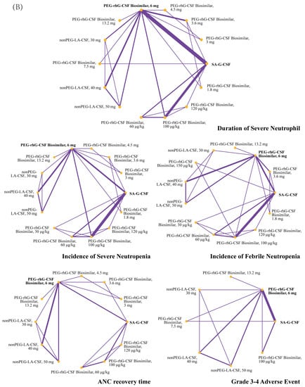 Network graph for evaluated outcomes in dose-based analysis (A) and drug-based analysis (B). Line width is proportional to the number of RCTs comparing each pair of treatments. ANC = absolute neutrophil count. SA-G-CSF = short-acting G-CSF.