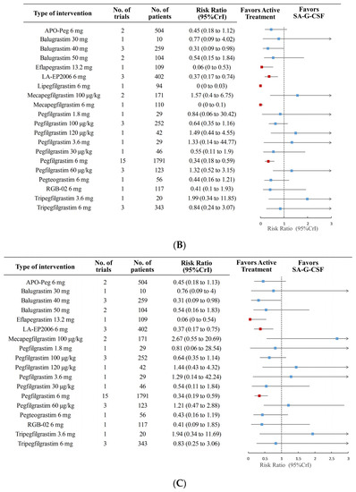 Moreover, lipegfilgrastim 6 mg, mecapegfilgrastim 6 mg, eflapegrastim 13.2 mg, LA-EP2006 6 mg, and pegfilgrastim 6 mg had a lower incidence of FN than SA-G-CSF (Figure 3B), with an RR ranging from 0 to 0.74 (very low to high certainty of the evidence). The removal of studies with a high RoB did not change the result (Figure 3C).