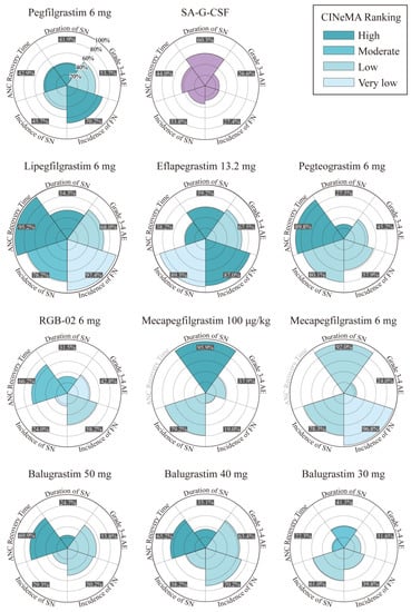 Summary of rose charts for the overall profile of most treatments across the five outcomes. Darker hues of cyan indicate higher levels of confidence in the evidence for the comparison of the corresponding treatments vs. SA-G-CSF (categorized into four levels: very low, low, moderate, and high quality). The light purple color identifies SA-G-CSF as the common comparator. SA-G-CSF = short-acting granulocyte colony-stimulating factor.