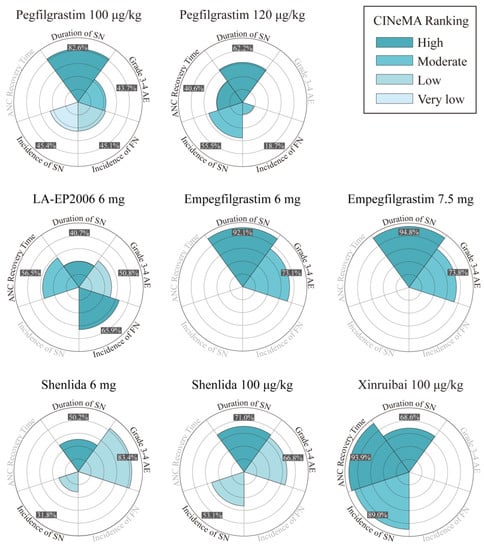 Overall, lipegfilgrastim 6 mg and eflapegrastim 13.2 mg were the most beneficial agents owing to their high efficacy rates (lipegfilgrastim 6 mg: ANC recovery time 95.2%, FN 97.4%; eflapegrastim 13.2 mg: FN 87%, SN 89.3%) and considerable safety profiles (lipegfilgrastim 6 mg: SAEs 68%; eflapegrastim 13.2 mg: SAEs 67.5%). Shenlida 6 mg was demonstrated to be the safest with the lowest incidence of SAEs. However, it was less effective in DSN and ANC, with the efficacy rates being 50.2% and 30%, respectively.