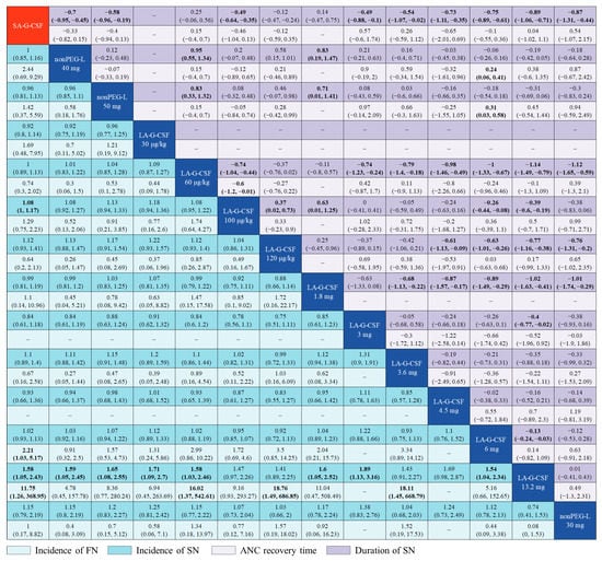 The following supporting information can be downloaded at https://www.mdpi.com/article/10.3390/cancers15143675/s1, Figure S1: Risk of Bias graph (review authors’ judgments about each risk of bias item presented as percentages across all included trials); Figure S2. Risk of Bias graph (review authors’ judgments about risk of bias in each trial); Figure S3. Forest plots of the network meta-analysis for the duration of severe neutropenia comparing different LA-G-CSFs with reference drug of pegfilgrastim 6 mg; Figure S4. CINeMA rankings comparing different LA-G-CSFs with SA-G-CSF (A) and with pegfilgrastim 6 mg (B) for the duration of SN in drug-based analysis; Figure S5. Forest plots of the network meta-analysis for absolute neutrophil count recovery time comparing different LA-G-CSFs with SA-G-CSF; Figure S6. Forest plots of the network meta-analysis for absolute neutrophil count recovery time comparing different LA-G-CSFs with ligpegfilgrasim 6 mg; Figure S7. CINeMA rankings comparing LA-G-CSFs with SA-G-CSF for absolute neutrophil count recovery time in drug-based analysis; Figure S8. Forest plots of the network meta-analysis for incidence of severe neutropenia comparing different LA-G-CSFs with SA-G-CSF; Figure S9. CINeMA rankings comparing LA-G-CSFs with SA-G-CSF for incidence of severe neutropenia in drug-based analysis; Figure S10. CINeMA rankings comparing LA-G-CSFs with SA-G-CSF for incidence of FN in drug-based analysis; Figure S11. (A). Forest plots of the network meta-analysis for incidence of grade 3–4 adverse events comparing different LA-G-CSFs with SA-G-CSF (rhG-CSF); (B). CINeMA rankings comparing LA-G-CSF with SA-G-CSF of G3-4 adverse event in drug-based analysis; Figure S12. Forest plots of the network meta-analysis for the duration of severe neutropenia comparing different doses of LA-G-CSFs with 6 mg; Figure S13. CINeMA rankings comparing LA-G-CSF 6 mg with other doses for duration of SN; Figure S14. Forest plots of the network meta-analysis for absolute neutrophil count recovery time comparing different doses of LA-G-CSFs with 6 mg; Figure S15. CINeMA rankings comparing LA-G-CSF 6 mg with other doses for absolute neutrophil count recovery time; Figure S16. Forest plots of the network meta-analysis for incidence of severe neutropenia comparing different doses of LA-G-CSFs with 6 mg; Figure S17. CINeMA rankings comparing LA-G-CSF 6 mg with other doses for incidence of severe neutropenia; Figure S18. Forest plots of the network meta-analysis for incidence of febrile neutropenia comparing different doses of LA-G-CSFs with 6 mg; Figure S19. CINeMA rankings comparing LA-G-CSF 6 mg with other doses for incidence of febrile neutropenia; Figure S20. Forest plots of the network meta-analysis for grade 3–4 adverse events comparing different doses of LA-G-CSFs with 6 mg; Figure S21. Forest plots of the network meta-analysis for grade 3–4 adverse events comparing different doses of LA-G-CSFs with 13.2 mg; Figure S22. CINeMA rankings comparing LA-G-CSF 6 mg with other doses for incidence of grade 3–4 adverse events in dose-based analysis; Table S1. SUCRA results (percentages) for other drugs of LA-G-CSFs; Table S2 PRISMA checklist.