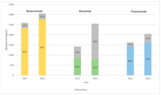 Figure 1 describes the number of reports for bevacizumab, trastuzumab, and rituximab biologics and their respective biosimilars. Table 3, Table 4 and Table 5 summarize the characteristics of each report by patients’ sex (female, male, and unknown), age range (0–17 years, 18–64 years, 65–85 years, over 85 years, and unknown), and type of reporter (healthcare professional, and non-healthcare professional) for all medicine products in study. A total of 13,306 reports were collected for these products: 9806 reports (74%) referred to the original products and 3500 (26%) to biosimilars.