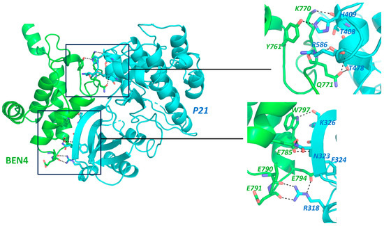 Protein–Protein interaction prediction through HADDOCK 2.4 Docking software [34,35]. Interaction of BEN4 domain of BEND3 (Green) with p21 (Cyan), Full protein structure along with interaction interface, Insets: Protein structure with highlighted Interacting amino acid. Interactions were shown by dotted lines. Labelling color corresponds to the contributing partner. Main chain shown only in cases it is involved in the proposed interaction.