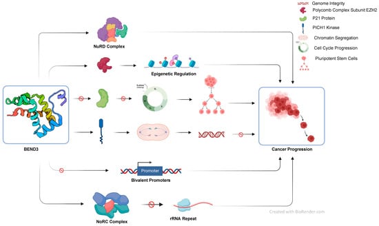 BANP, E5R, and Nac1 (BEN)-Domain containing protein 3 (BEND3), a transcription factor, has been recently identified to regulate pluripotency by repressing pro-differentiation genes both in humans [5] and mice [6]. It is highly expressed in pluripotent cells and binds to promoters of genes involved in differentiation, regulating the transcription of these genes. It is known to interact with various chromatin modifiers and transcriptional repressors such as the NoRC complex [7], HDACs [8,9], PICH1 [10], Sall4 [9], and with members of the nucleosome remodeling and deacetylase (NuRD) complex in a context-dependent manner [8,11]. BEND3 occupies enhancers of CGI-associated genes in mouse embryos, regulating their transcription [6]. In a recent study on the genome-wide CRISPER/Cas9 knockout screen in acute myeloid leukemia (AML) cells, BEND3 knockout showed resistance to TAK-243, an inhibitor of ubiquitin-like modifier-activating enzyme 1. TAK-243 is a phase I clinical trial drug for advanced malignancies [12]. Elevated BEND3 expression is also reported in multiple cancer types across The Cancer Genomic Atlas (TCGA) Program [13]. Although the role of BEND3 in cancer progression is still emerging and gaining prominence, nonetheless, the exact mechanism is not yet fully understood. The objective of this review is to provide a perspective on the understanding of the possible pathways BEND3 may participate in to play a role in tumorigenesis.