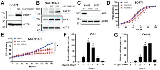 EO771 cells express PARP7 and are responsive to DMXAA stimulated increases in type I interferon (IFN) signaling. (A) EO771 or (B) NCI-H1373 cells were treated with RBN-2397 for 24 h to inhibit PARP7 activity and enable visualization with Western blotting. Levels of AHR were also determined. (C) AHR levels in WT and AhrKO PyMT cells and EO771 cells were determined with Western blotting. (D) RBN-2397 treatment slightly but significantly reduces EO771 cell proliferation, whereas (E) NCI-H1373 cells are sensitive to the antiproliferative effects of RBN-2397. Cell proliferation was analyzed in an IncuCyte instrument. (F,G) EO771 cells are responsive to stimulation with the STING activator, DMXAA. Cells were treated with DMXAA for 1, 2, 4, 6, and 24 h, and relative (F) Ifnb1 and (G) Cxcl10 mRNA levels were analyzed by RT-qPCR. * Denotes statistical significance (p < 0.05) from the DMSO treated samples (D,E) or untreated samples (0 h) (F,G). Original western blots has been presented in File S1.