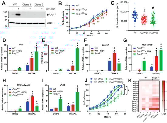 PARP7 loss or its inhibition increases type I IFN signaling. (A) PARP7 protein levels were determined in EO771 WT cells and Parp7KO clone 1 and 2 by Western blotting. Only the WT displays a PARP7 band in response to PARP7 inhibition. (B) Both Parp7KO clones proliferate significantly slower than the WT cells. (C) EO771 Parp7KO clones 1 and 2 form significantly smaller spheroids than the WT cells. (D) Ifnb1 mRNA levels increased in EO771 Parp7KO and RBN-2397-treated WT cells. Cells were treated with 10 µg/mL of DMXAA (+/− 100 nM RBN-2397) for 2 h, and relative mRNA levels were measured with RT-qPCR. (E) IFN-β protein levels are higher after 4 h treatment of WT cells with DMXAA +/− RBN-2397 and DMXAA in EO771 Parp7KO cells. (F) Cxcl10 mRNA levels increased after 6 h DMXAA treatment in WT and Parp7KO cells, with higher levels in WT cells co-treated with DMXAA and RBN-2397 compared with DMXAA-treated Parp7KO cells. (G) Ifnb1 levels increased in both untreated and DMXAA-treated Parp7H532A MEFs, and in WT MEFs co-treated with DMXAA and RBN-2397. (H) Cxcl10 mRNA levels increased after 6 h treatment with DMXAA Parp7H532A and WT MEFs, with higher levels in WT MEFs co-treated with DMXAA + RBN-2397 compared with DMXAA Parp7H532A MEFs. (I) Parp7KO cells display elevated constitutive Pdl1 levels compared with WT cells treated +/− DMXAA. (J) DMXAA treatment results in a significant decrease in proliferation in the EO771 WT and Parp7KO cells, with greater effect observed in Parp7KO cells. (K) Heatmap showing expression levels of different PARPs in response to DMXAA and/or RBN-2397 in EO771 WT and Parp7KO cells. Cells were treated with 10 µg/mL of DMXAA (+/− 100 nM RBN-2397) for 2 h, and relative mRNA levels were measured with RT-qPCR. * Denotes statistical significance (p < 0.05) compared to DMSO; # (for (B) these are colored to indicate which graph they correspond to) denotes statistical significance due to loss the of PARP7 activity. Original western blots has been presented in File S1.