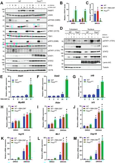 Levels of unphosphorylated interferon stimulated gene factor 3 (ISGF3) are upregulated in EO771 Parp7KO cells. (A) EO771 WT and Parp7KO cells have intact STING regulated type I IFN signaling pathway. The expression and/or phosphorylation of cGAS, STING, TBK1 and IRF3 are similar between WT and Parp7KO cells. However, Parp7KO cells have increased levels of unphosphorylated signal transducer and activator of transcription 1 (STAT1), STAT2, and interferon regulatory factor 9 (IRF9). Cells were treated with 10 µg/mL of DMXAA (+/− 100 nM RBN-2397) for 0, 2, 6, or 24 h, and samples were subjected to SDS-PAGE and Western blotting. (B) Levels of native STAT1 are higher in the EO771 Parp7KO cells independent of DMXAA treatment. (C) Levels of phosphorylated STAT1 after DMXAA treatment relative to native STAT1 are lower in the EO771 Parp7KO cells compared with both WT and RBN-2397-treated WT cells. (D) EO771 Parp7KO cells have increased cytoplasmic and nuclear levels of STAT1, STAT2, and IRF9 in both untreated and treated samples. (E) Stat1, (F) Stat2, and (G) Irf9 mRNA levels are higher in EO771 Parp7KO cells and after 24 h RBN-2397 treatment in WT cells. (H) Expression levels of P-ISGF3 target genes Myd88 is not significantly affected by PARP7 loss, while target genes (I) Adar and (J) Irf1 are slightly higher in the EO771 Parp7KO cells. (G) Expression levels of U-ISGF3 target genes, (K) Isg15 and (L) Mx1, and (M) ISG15-induced gene Usp18 are all significantly higher in EO771 Parp7KO cells and RBN-2397-treated WT cells. Cells were treated with 10 µg/mL of DMXAA (+/− 100 nM RBN-2397) for 6 h, and mRNA levels were quantified with RT-qPCR. * Denotes statistical significance (p < 0.05) compared to no treatment (E–G) or DMSO (H–M); # denotes statistical significance due to the loss of PARP7. Original western blots have been presented in File S1.