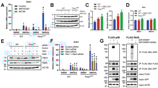 Nuclear factor κB (NF-κB) is involved in the increased type I IFN signaling observed in EO771 Parp7KO cells. (A) Inhibition of TANK-binding kinase 1 (TBK1) with MRT67307 significantly decreases Ifnb1 mRNA levels in EO771 Parp7KO cells but not in WT cells. Inhibition of both TBK1 and the IκB kinases (IKKs) with BX795 blocks Ifnb1 mRNA expression in all cases. Cells were treated with either 1 µM of MRT67307 or 100 nM of BX795 for 24 h, followed by 10 µg/mL of DMXAA for 2 h. (B) Treatment with DMXAA and/or RBN-2397 increases protein levels of both p50 and RelA in EO771 WT cells while levels are higher in Parp7KO cells in both untreated and treated cells. Cells were treated with 10 µg/mL of DMXAA (+/− 100 nM of RBN-2397) for 24 h and proteins were visualized by Western blotting. (C) Levels of expressed NF-κB subunits are higher in response to PARP7 inhibition, and levels of RelA are significantly higher in the Parp7KO cells. Protein levels of p50 and RelA in untreated samples were quantified by normalizing to the loading control. (D) Expression levels of Rela mRNA are not affected by DMXAA or PARP7. (E) Knockdown of either TBK1, RelA, or both, in EO771 WT and Parp7KO cells. After 48 h of transfection with 25 nM of siRNA targeting Tbk1, Rela, or both, protein levels were visualized by Western blotting. (F) Knockdown of TBK1 and RelA results in significantly decreased Ifnb1 mRNA levels in Parp7KO cells but not in WT cells. After 48 h of transfection with 25 nM of siRNA for Tbk1, Rela, or both, cells were treated with 10 µg/mL of DMXAA for 2 h. (G) p50 and RelA interact with WT and catalytically inactive PARP7, and RelA is MARylated by WT PARP7. Cos-1 cells were transfected with FLAG-tagged p50 or RelA together with either GFP-tagged WT PARP7 or the catalytically inactive H532A mutant. The FLAG-tagged p50 or RelA was immunoprecipitated, and the interaction and modification was examined by Western blotting. * Denotes statistical significance (p < 0.05) compared to DMSO; # denotes statistical difference due to the loss of PARP7; “a” denotes statistical difference compared to no inhibitor (A) or to the nontargeting siRNA (F). Original western blots have been presented in File S1.