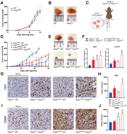 To investigate the role of PARP7 loss on mammary tumor growth and antitumor immunity, we determined the ability of WT and Parp7KO EO771 cells to develop tumors in immunodeficient NSG mice, and in syngeneic tumor studies using WT (Parp7+/+) and catalytic mutant Parp7H532A mice. No differences in tumor growth were observed in NSG mice injected with WT or Parp7KO cells (Figure 5A,B). In immunocompetent mice, loss of PARP7 in the cancer cells significantly decreased tumor growth compared to WT cells in Parp7+/+ mice (Figure 5C,D). However, injection of WT cells into Parp7H532A mice resulted in reduced tumor growth compared with WT cells or Parp7KO injected into Parp7+/+ mice. Injection of Parp7KO cells into Parp7H532A mice failed to grow tumors after 30 days, and those that developed regressed (Figure 5D,E). Similar findings were observed when injecting Parp7H532A mice with two additional EO771 Parp7KO clones (Supplementary Materials Figure S7). Ifnb1 and Cxcl10 levels were increased in response to PARP7 loss in the tumors (Figure 5F). Since these cytokines are known to attract immune cells, we stained tumor sections with antibodies against T cells (CD3) or macrophages (CD68) (Figure 5G,I). The levels of tumor infiltrating T cells were significantly higher in the tumors arising from the Parp7KO cells, while there was no significant difference between the recipient genotype (Figure 5H). Interestingly, the opposite was observed for tumor infiltrating macrophages, where loss of functional PARP7 in the recipient mice resulted in significantly increased levels of macrophages; however, this was independent of PARP7 expression in the cancer cells (Figure 5J). Taken together, these data show that loss of PARP7 in the tumors results in increased type I IFN signaling and subsequently increased T cell infiltration, while loss of PARP7 function in the recipient mice increased macrophage infiltration. The combined effect of PARP7 loss or its activity in both cancer cells and the immune system, impairs tumor growth.