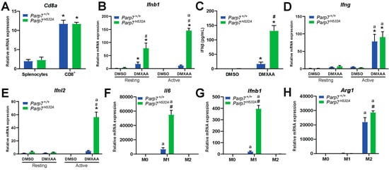Loss of PARP7 increases type I IFN signaling in CD8+ T cells and increases M1 macrophage signaling. (A) Enrichment of Cd8a mRNA verifies CD8+ T-cell isolation. Levels of Cd8a mRNA expression is increased in isolated CD8+ T cells compared to the splenocyte starting material. Expression levels were measured with RT-qPCR. (B) Levels of type I IFN Ifnb1 are significantly increased in both resting and activated CD8+ T cells isolated from Parp7H532A mice. Cells were either kept in a resting state or activated with CD3/CD28 beads prior to treatment with 10 µg/mL of DMXAA for 24 h. (C) Loss of PARP7 function results in higher secreted levels of IFN-β from activated CD8+ T cells treated with 10 µg/mL of DMXAA for 24 h. (D) The levels of the type II IFN Ifng do not significantly differ between the genotypes, while (E) the levels of the type III IFN Ifnl2 are significantly upregulated in activated CD8+ T cells isolated from Parp7H532A mice. (F) Levels of Il6 and (G) Ifnb1 are higher in M1 macrophages isolated from Parp7H532A mice compared with Parp7+/+ mice. (H) M2 macrophages from Parp7H532A mice have higher expression levels of Arg1. For (F–H), bone-marrow-derived macrophages were isolated and polarized, and the mRNA levels were determined with RT-qPCR and normalized to the M0. * Denotes statistical significance (p < 0.05) compared to splenocytes (A) or DMSO (B–E); # denotes statistical significance due to loss of PARP7 function (B,C,E–H); “a” denotes statistical significance compared to the resting cells (B,D,E) or the unpolarized M0 macrophages (F–H). n = 3.