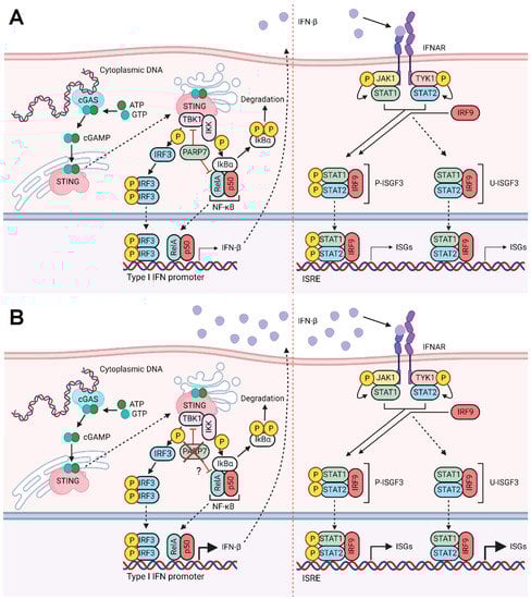 Proposed mechanism of action. (A) In the presence of cytoplasmic DNA, cGAS is activated and catalyzes the synthesis of cGAMP, which activates STING. STING subsequently activates TBK1, which phosphorylates and activates IRF3. STING activation also results in the release of NF-κB from IκBα. Both pIRF3 and NF-κB translocate to the nucleus and bind to the promoter region of type I IFNs, such as Ifnb1. PARP7 inhibits the activity of both TBK1 and the RelA subunit of NF-κB. Secreted IFN-β binds to IFNAR, which results in phosphorylation of STAT1 and STAT2. Together with IRF9, they form P-ISGF3 which regulates the expression of ISGs. Upon sustained IFN-β, unphosphorylated ISGF3 is upregulated, which results in transcription of certain ISGs. (B) Loss of PARP7 results in increased production and secretion of IFN-β, which further increases both P-ISGF3 and U-ISGF3 signaling. Figure made in BioRender (license agreement YX25IUCM4M to J.M.).
