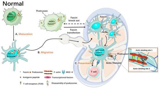 During the development of immature DCs into mature DCs, cytoskeletal changes take place [38]. Fascin is not expressed or is expressed at low levels in immature DCs but is highly expressed in mature DCs. Fascin is specifically induced and expressed during DC maturation, contributing to the dynamic assembly of veil-like membrane protrusions, the disassembly of podosomes, migration to lymph nodes, and the assembly of the immunological synapse [22].
