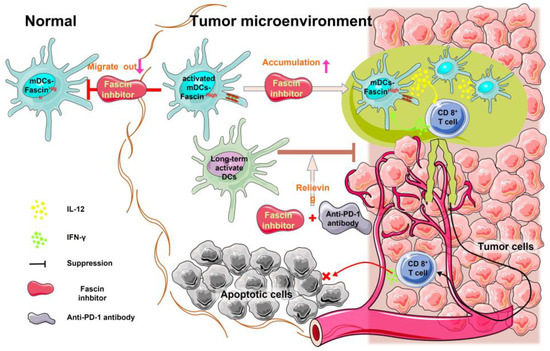 Furthermore, activated DCs produce interleukin 12 (IL-12), a pro-inflammatory cytokine produced by intratumoral DCs, which enhances the anti-tumor immune response [57]. Intratumoral DCs sense interferon γ (IFN-γ) released from neighboring T cells, leading to IL-12 production, which stimulates anti-tumor T cell immunity [58,59]. Prolonged activation of DCs results in lower IFN-γ secretion from T cells, and deficiencies in IL-12 affect T cell activation [59]. This leads to the induction of a T cell depletion program and the formation of an immunosuppressive microenvironment [60,61]. However, inhibition of fascin, in combination with anti-PD-1 antibodies, can relieve this inhibition, reactivate DCs, and initiate immune responses that inhibit tumor aggressiveness [37]. The contributions of IL-12 and IFN-γ to the anti-tumor effect of fascin inhibition and anti-PD-1 antibodies were verified using neutralizing anti-IL-12 and IFN-γ monoclonal antibodies [37]. Neutralization of IL-12 and/or IFN-γ eliminated the increased overall survival effect observed with the combination of the fascin inhibitor and anti-PD-1 antibody [37]. Hence, targeting high-fascin intratumoral DCs is crucial to enhance the anti-tumor immune response of anti-PD-1 antibodies (Figure 2).