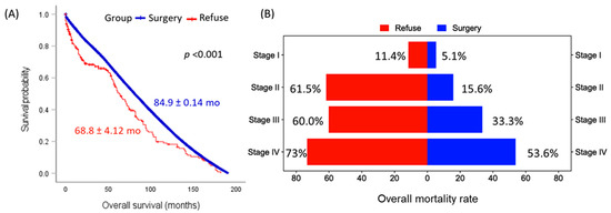 Comparison of overall survival in patients undergoing surgery versus those refusing surgery. (A) Kaplan–Meier survival curve comparing the surgery cohort (blue) and surgery-refusal group (red). Mean and standard-error survival times are presented. The log-rank test was employed for comparisons. (B) Bar chart illustrating the elevated mortality rate in patients who refused surgery compared to those who underwent surgery across all disease stages.