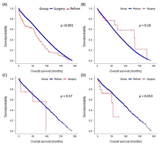 Stage-specific comparison of mean survival times in patients undergoing surgery versus those refusing surgery. (A) Stage I, (B) Stage II, (C) Stage III, (D) Stage IV. The log-rank test was employed for comparisons.