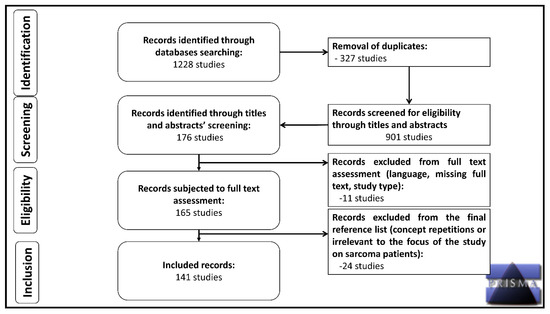 Our search yielded 1228 potentially eligible studies. After removing duplicates (n = 327) and screening titles and abstracts (n = 901), we deemed 176 studies eligible for full-text assessment. After removing those of them whose full text was not available in English or at all (n = 11), we examined the full text of 165 studies and eventually included 141. A PRISMA search flow diagram describing the search and selection process in detail can be found in Figure 1. A total of 22 out of these 141 articles were original research studies that included sarcoma patients. The characteristics of these 22 studies have been tabulated (Table 1).