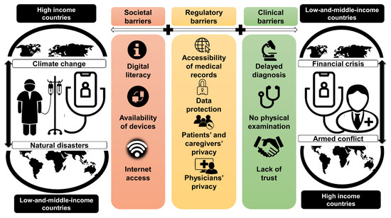Challenges regarding telemedicine. Societal, regulatory and clinical factors pose barriers to remote sarcoma care being compounded by structural inequalities across high- and low-and-middle-income countries and emerging political, financial and environmental crises.