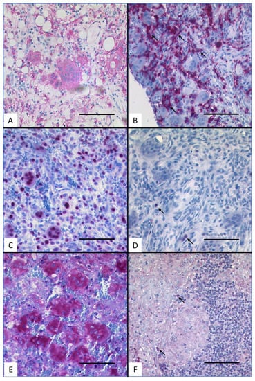 For the secondary antibody reaction, Dako REAL Detection System Alkaline Phosphatase/RED rabbit/mouse (cat# K5005) was used. Counterstaining followed, using Meyer’s hematoxylin with an incubation time of 5 min. Evaluation was performed in a blinded, neutral manner and by consensus diagnosis using a multi—head microscope. Immunoreactivity of giant cells was categorised into four categories, depending on the proportion of positively stained cells: “no immunoreactivity detected”, “immunoreactivity in up to 30%”, “immunoreactivity in more than 30% and up to 70%” and “immunoreactivity in more than 70%” of the total number of analysed cells. A typical example of categorisation is given in Figure 1. Additional images of positive staining of different lesions and antigens can be found in the Supplementary Material Figures S1–S5. The bar marks the respective magnification.