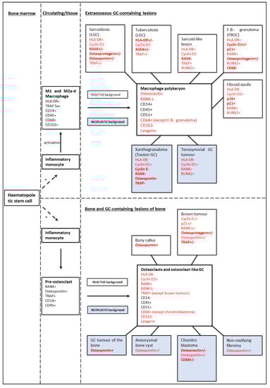 Since the early description of multinucleated giant cells (GCs), these cells have been observed to emerge against different backgrounds [1,2]. Osteoclasts in healthy bone are known as physiological GCs. GCs associated with various pathological conditions may be further divided into GCs of reactive/inflammatory lesions like tuberculosis, sarcoidosis, foreign-body granuloma, and brown tumour, and GCs within neoplastic lesions. These include the so-called GC-containing lesions such as GC tumour of the bone, aneurysmal bone cysts, chondroblastoma, and giant-cell-containing osteosarcoma. Most GCs appear cytologically similar, with some differences in their cellular shape [3]. For instance, Langhans GCs in tuberculosis and sarcoidosis typically show a circular horseshoe-like pattern of nuclei, thereby differing from the GCs of other lesions, where the nuclei are arranged in the cytoplasm more randomly [4,5]. All GCs are polykaryons with a drastically varying number of nuclei, and most are derived from circulating inflammatory monocytes that, in turn, have developed from haematopoietic stem cells [3,6].