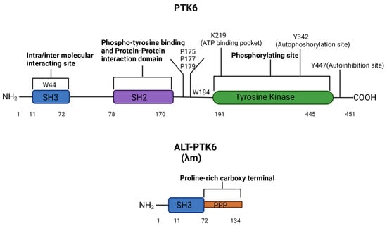 PTK6 domains structure and regulatory residues. The full-length PTK6 protein is made up of a 451 amino acids chain with an N-terminal SH3 domain, an SH2 domain, and a C-terminal tyrosine kinase domain. The tyrosine kinase domain consists of three regulatory residues K219 (in the ATP binding pocket), Y342 (autophosphorylation site), and Y447 (autoinhibition site). Mutation of K219 results in a kinase-dead PTK6, mutation of Y342 reduces the activation of PTK6, and mutation of Y447 makes a constitutively active PTK6. W44 in the SH3 domain and P175, P177, P179, and W184 in the linker are key for intra-molecular interactions affecting catalytic activity [37]. The alternative splice form of PTK6 (ALT-PTK6) is 134 amino acids long, consisting of an SH3 domain linked with a proline-rich carboxy-terminal tail.