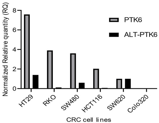 Relative mRNA expression of PTK6 transcripts in CRC cell lines. The graph depicts relative PTK6 and ALT-PTK6 expression. Data were analyzed using the ΔΔCt method and normalized to the reference gene GAPDH. The graph was plotted using GraphPad PRISM 9 program.
