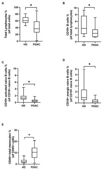 Immunological variables among patients with pancreatic adenocarcinoma (PDAC) and sex- and age-matched healthy donors (HD) at baseline. The mean percentage of circulating total lymphocytes (A), CD19+ B cells (B), activated naïve B cells (C), and anergic naïve B cells (D) was significantly lower in PDAC patients than in HD. The mean percentage of circulating total CD45+ monocytes was significantly higher in PDAC patients than in HD (E). Inter-group variables were compared using the Welch two sample t-test: significant (*) = p < 0.05.