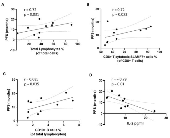 As shown in Figure 2A–C, the percentage of total lymphocytes, effector memory CD8+ cytotoxic T cells, and CD19+ B cells at baseline positively correlated with the PFS (r = 0.72, p = 0.031; r = 0.72, p = 0.023; and r = 0.68, p = 0.035, respectively) (Figure S5A–F).