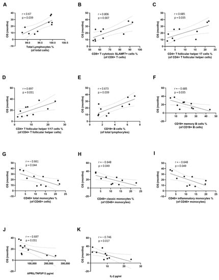 Similarly, the percentage of total lymphocytes, effector memory CD8+ cytotoxic T cells, CD4+ T follicular helper 17 cells and 1/17 cells at baseline positively correlated with OS (r = 0.67, p = 0.039; r = 0.81, p = 0.007; r = 0.68, p = 0.035; and r = 0.7, p = 0.031, respectively) (Figure 3A–D and Figure S6A–F). CD19+ B cells also positively correlated with OS (r = 0.67, p = 0.039) (Figure 3E). Conversely, a negative correlation was found between the percentage of circulating memory B cells, CD45+ total monocytes, classic monocytes, and inflammatory monocytes and OS (r = −0.68, p = 0.035; r = −0.66, p = 0.044; r = −0.65, p = 0.049; and r = −0.65, p = 0.049, respectively) (Figure 3F–I). Finally, as shown in Figure 3J, baseline serum levels of APRIL/TNFSF13 negatively correlated with OS (r = −0.7, p = 0.03) whereas serum levels of IL-2 negatively correlated with both OS and PFS (r = −0.75, p = 0.017 and r = −0.79, p = 0.01, respectively) (Figure 3K and Figure 2D, respectively).