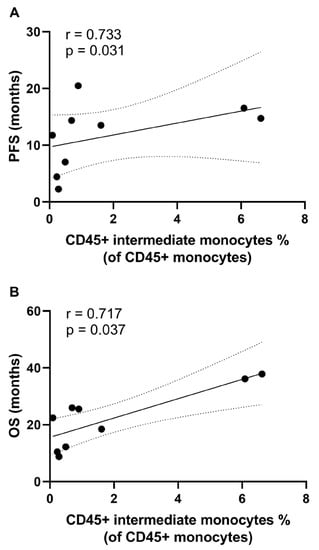 We then performed correlation studies between the immunological variables at 4-month follow-up and PFS (Figure S7A–F) and OS (Figure S8A–F). When considering all PDAC patients included in this study (n = 10), a statistically significant positive correlation was found between the percentage of circulating intermediate monocytes at 4-month follow-up and PFS (r = 0.73, p = 0.031) and OS (r = 0.72, p = 0.037) (Figure 4A,B).
