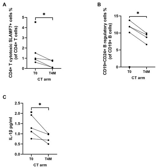 Effects of chemotherapy (CT arm) on immune cells and cytokines after 4 months of therapy. The mean percentage of circulating CD4+ cytotoxic T lymphocytes (A) and CD24+ B regulatory cells (B) were significantly lower at 4 month (T4M) compared to baseline (T0). The mean serum concentration of interleukin (IL)-1β (C) was significantly lower at 4 months (T4M) compared to baseline (T0). Square dot represents the patient in the CT arm who did not reach 4-month follow-up. Intra-group variables were compared using the paired t-test: significant (*) = p < 0.05.