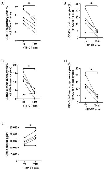 Effects of HybridTherm Probe ablation plus chemotherapy (HTP-CT arm) on immune cells and cytokines after 4 months of therapy. The mean percentage of circulating CD4+ T regulatory cells (A), CD45+ monocytes (B), CD45+ classic monocytes (C), and CD45+ inflammatory monocytes (D) were significantly lower at 4 months (T4M) compared to baseline (T0). The mean serum concentration of osteopontin was significantly higher at 4 months (T4M) compared to baseline (T0) (E). Intra-group variables were compared using the paired t-test: significant (*) = p < 0.05.