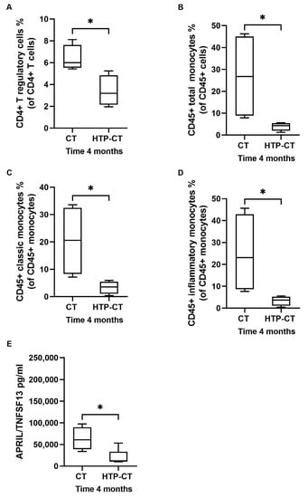Indeed, T regulatory cells, total monocytes, classic and inflammatory monocytes in the HTP-CT arm four months after treatment were significantly decreased compared to patients treated with CT alone (p = 0.02 for T regulatory cells and p = 0.03 for all monocytes comparisons) (Figure 7A–D). At four months, patients in the HTP-CT arm also showed significantly reduced serum levels of APRIL/TNFSF13 compared to patients in the CT arm (p = 0.04) (Figure 7E and Figure S13A–F).
